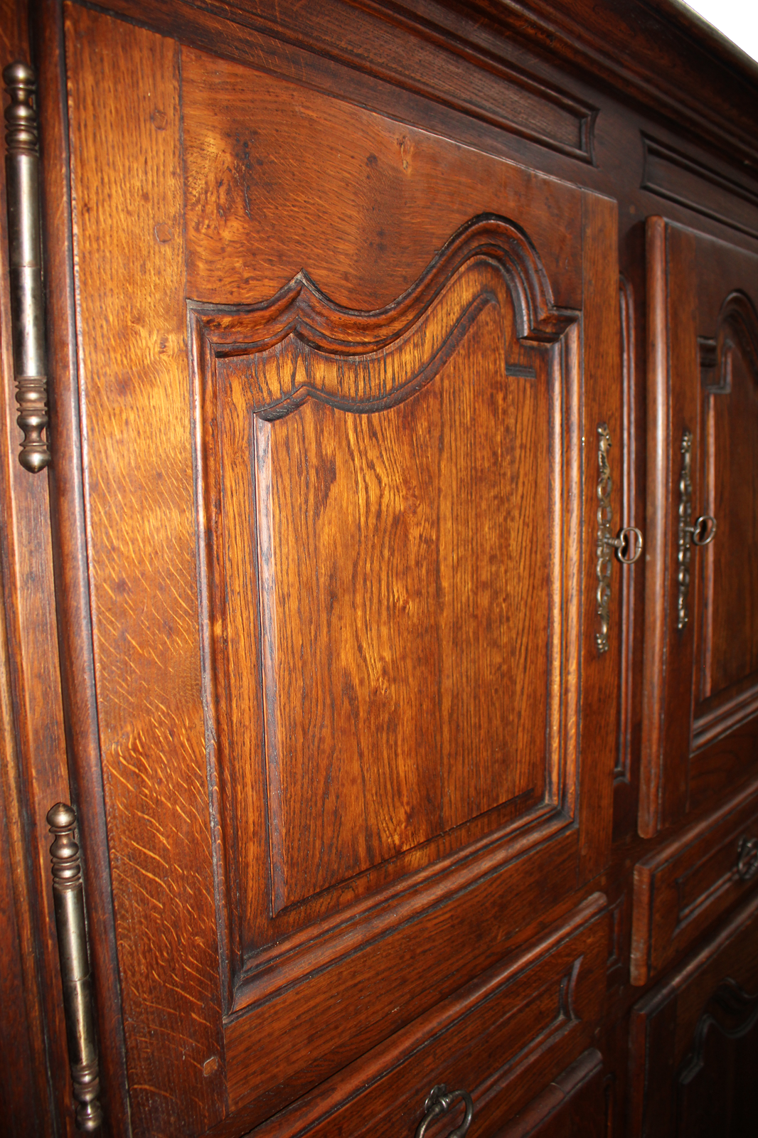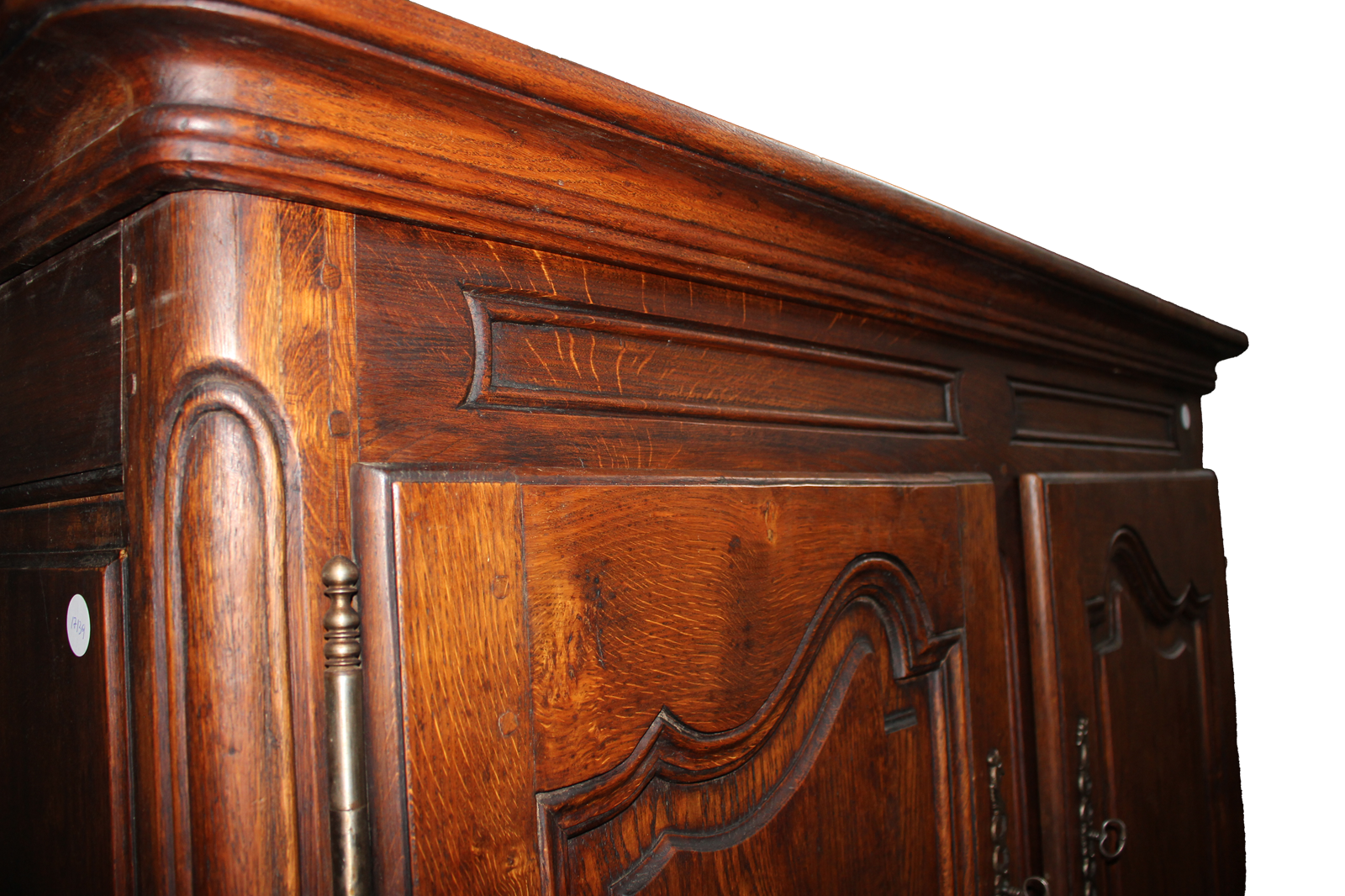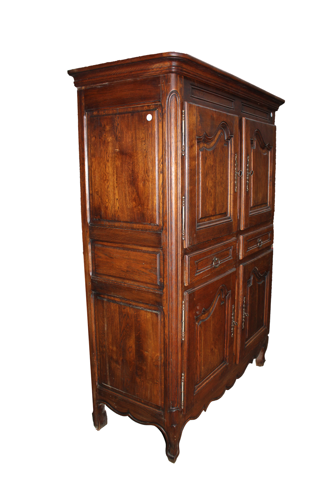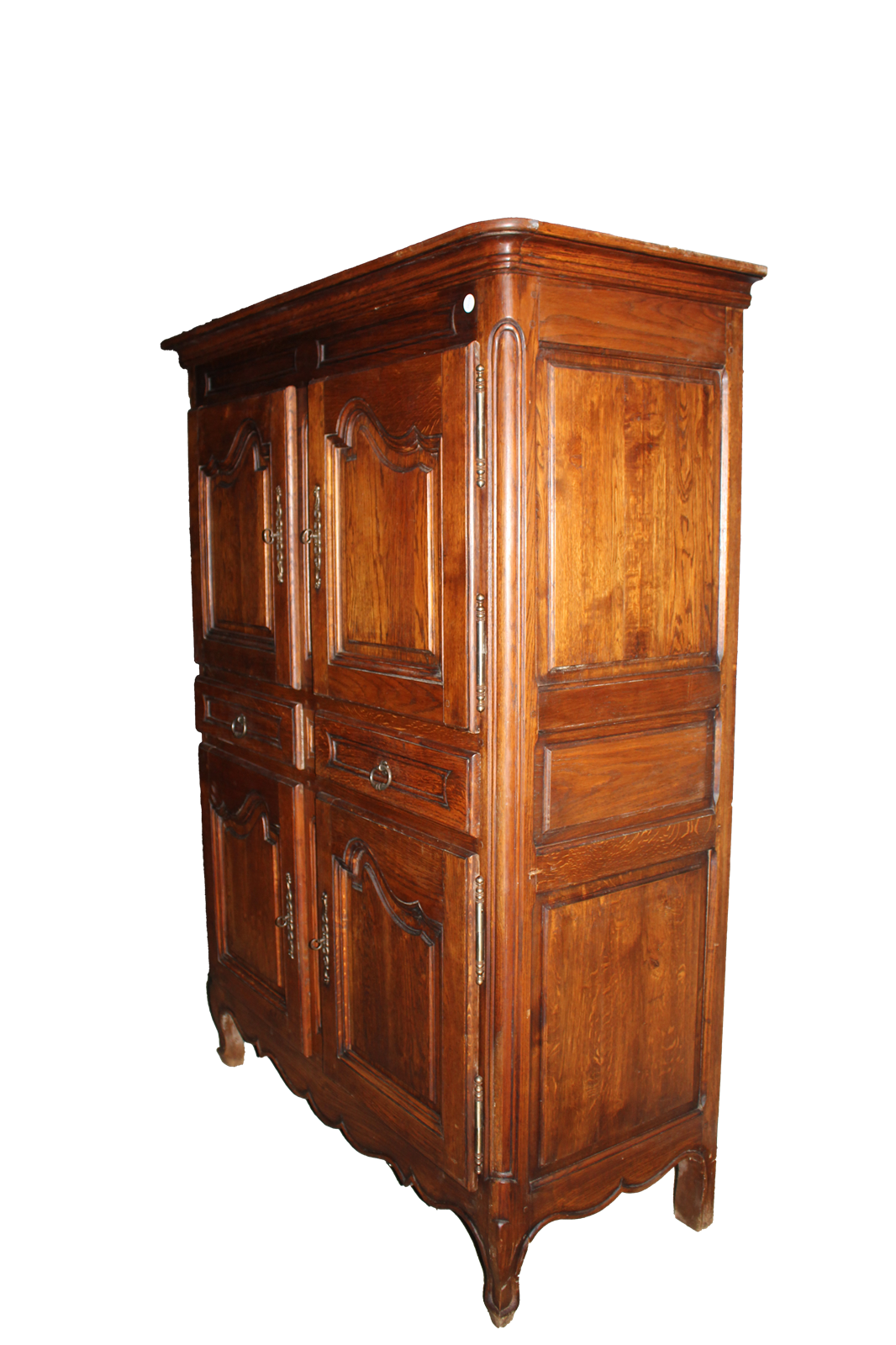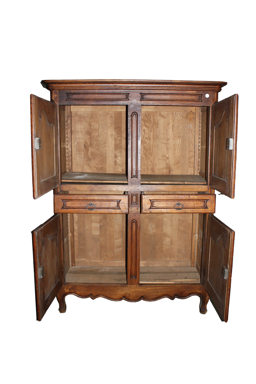 Splendido stipo francese di grande fascino, realizzato in pregiato rovere massello con una calda patina d’epoca che ne esalta la venatura naturale. La linea mossa e armoniosa, ispirata al gusto Provenzale, si distingue per le quattro ante sagomate e modanate, riccamente profilate a motivi mistilinei, e i due cassetti centrali elegantemente incorniciati.