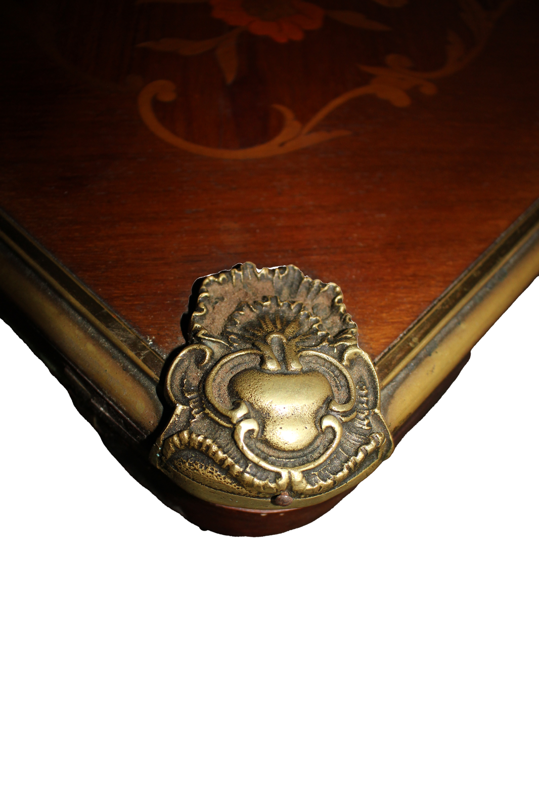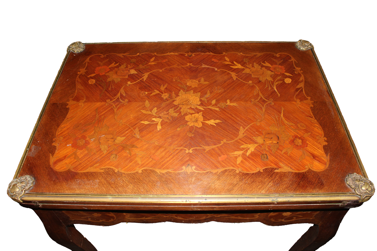 Raffinato tavolino da gioco di manifattura francese, realizzato in bois de rose e mogano, impreziosito da splendidi intarsi floreali sul piano e sulla fascia. Le eleganti linee sinuose, tipiche dello stile Transizione tra Luigi XV e Luigi XVI, sono valorizzate da finiture in bronzo dorato cesellato che ne sottolineano l’eleganza.