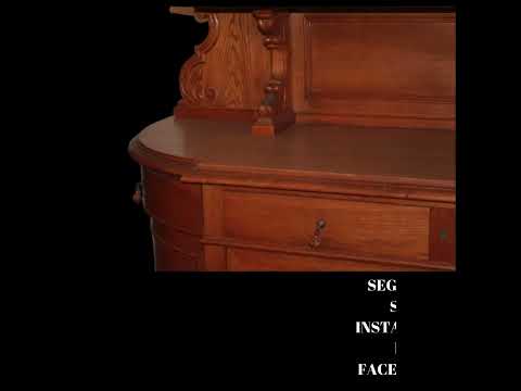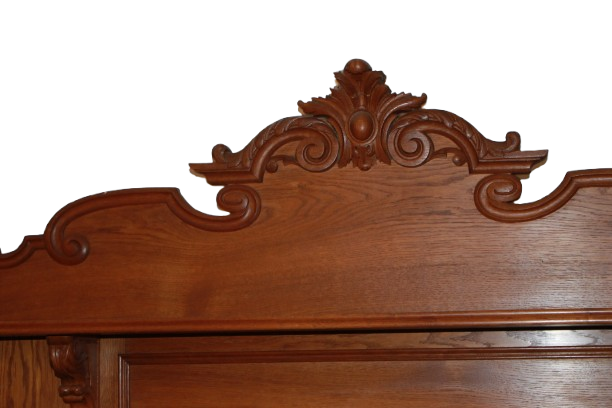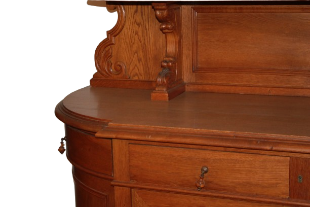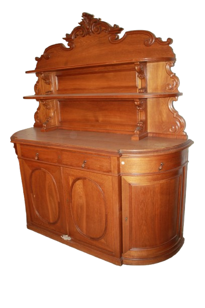 Grande credenza francese della seconda metà del 1800 stile Luigi Filippo in legno di rovere. Presenta alzata superiore composta da ripiani sostenuti da piccoli montanti torniti ed è coronata da un frontone sagomato riccamente intagliato, cassetti e 4 ante.