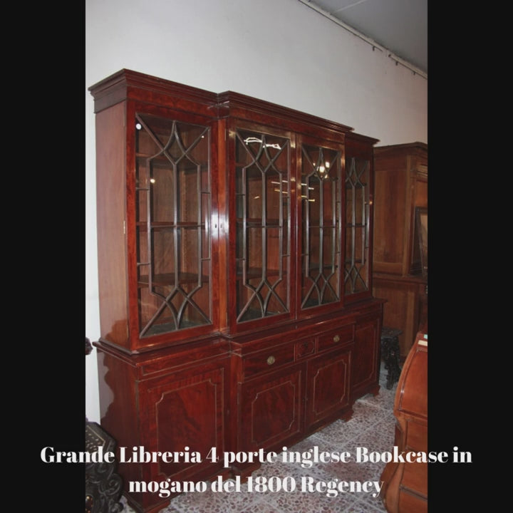 Grande libreria bookcase 4 porte inglese di metà 1800, stile Regency, in legno di mogano e piuma di mogano. Presenta 4 ante a vetro, 4 ante chiuse ed è dotata centralmente di cassetto.
