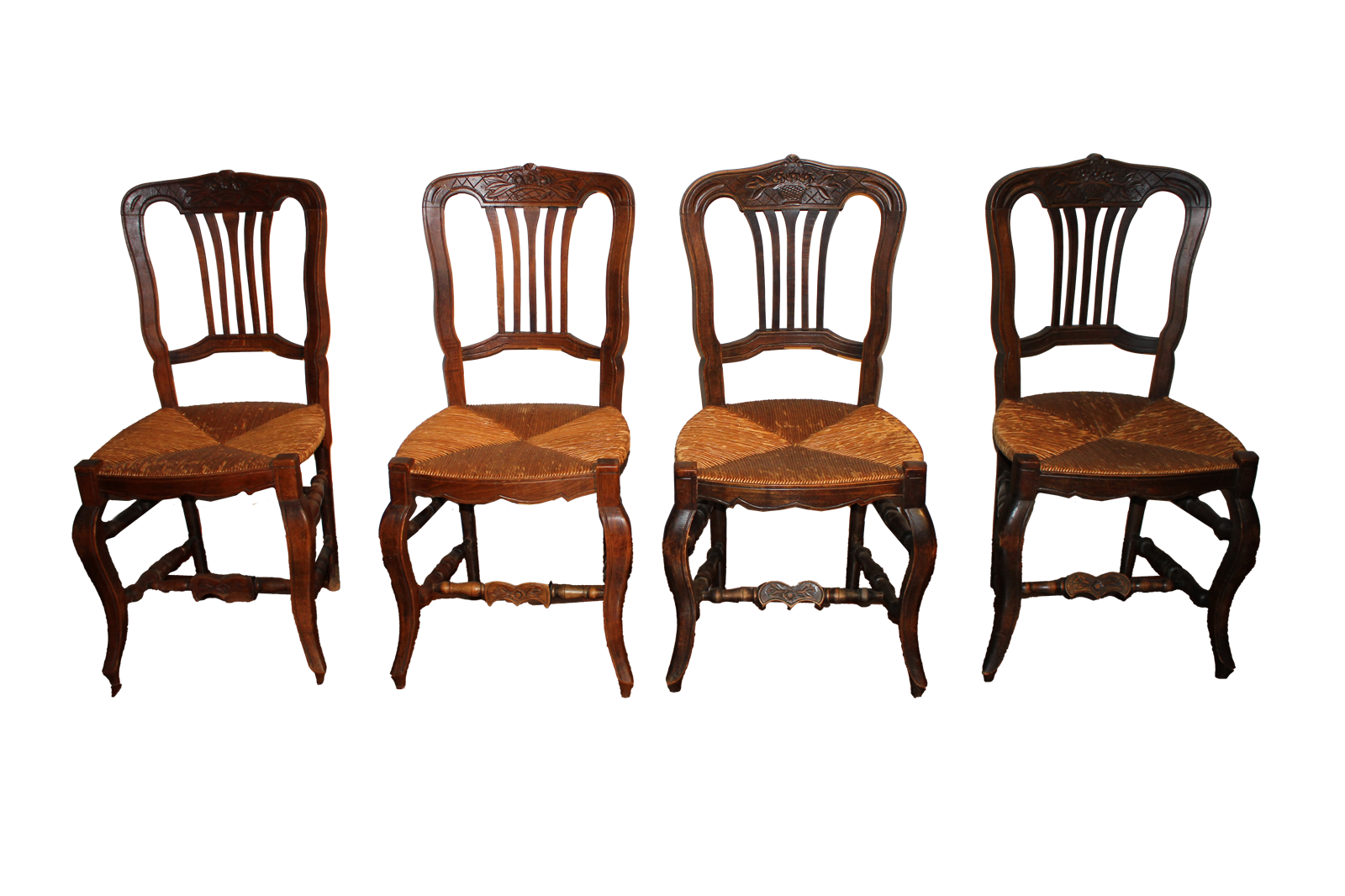 Gruppo di quattro sedie francesi di fine Ottocento in stile Provenzale, realizzate in pregiato legno di rovere, caratterizzate da eleganti motivi intagliati e da seduta in paglia di Vienna.