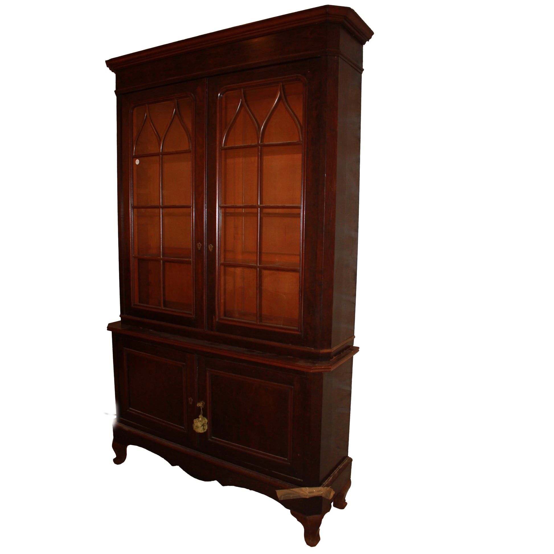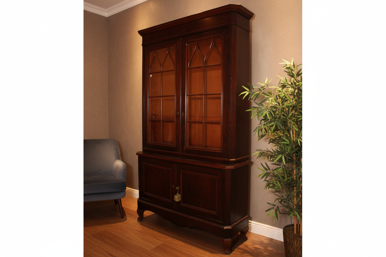 Libreria vetrina inglese di fine 1800 in legno di mogano. Presenta corpo superiore formato da due ante a vetrina e corpo inferiore dotato di 2 antine chiuse.