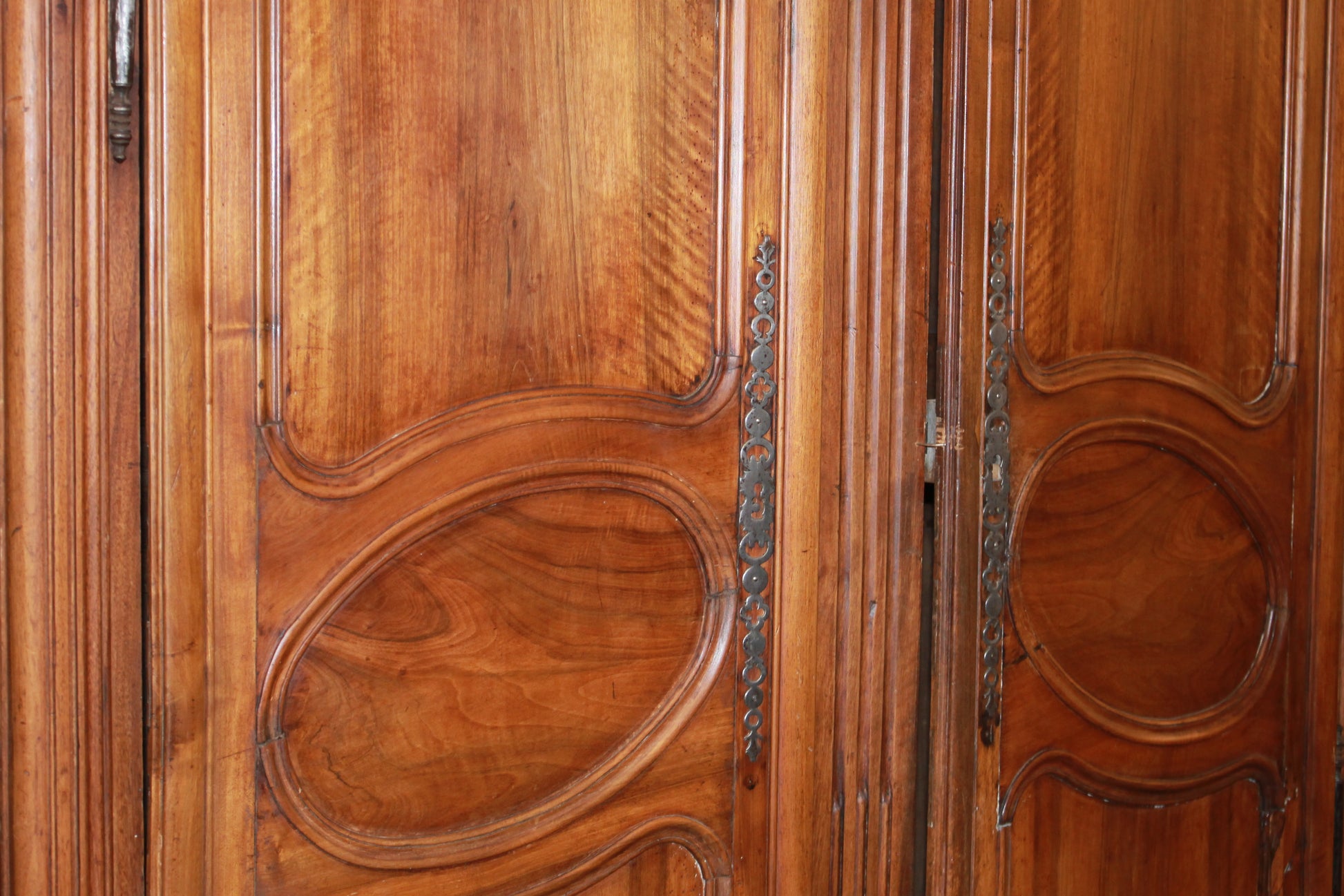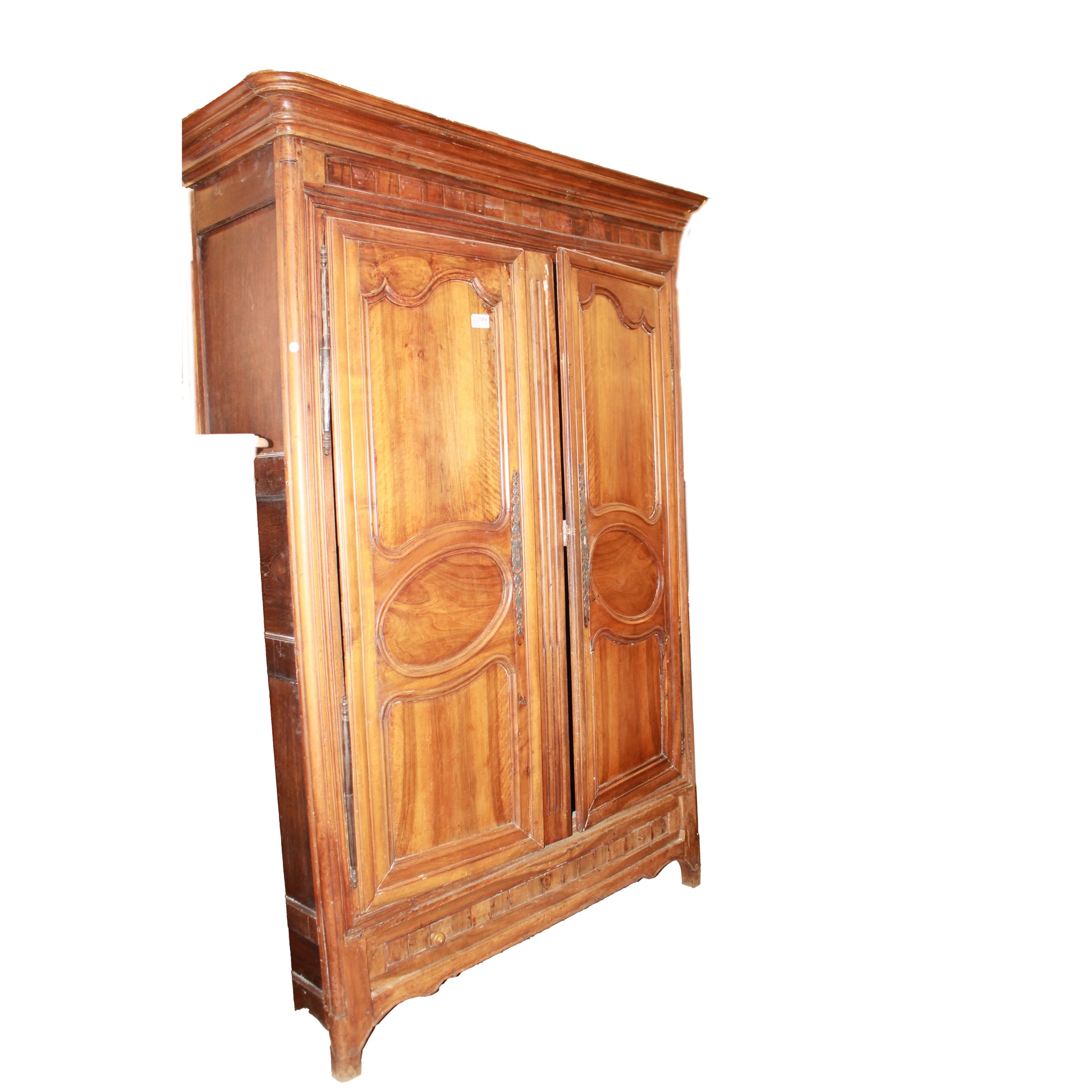 Grande armadio francese di fine 1700 stile Provenzale in legno di noce. Presenta 1 cassetto nella parte inferiore e le ante sono arricchite da pannellature sagomate con motivi mistilinei e riquadri centrali ovali in rilievo.