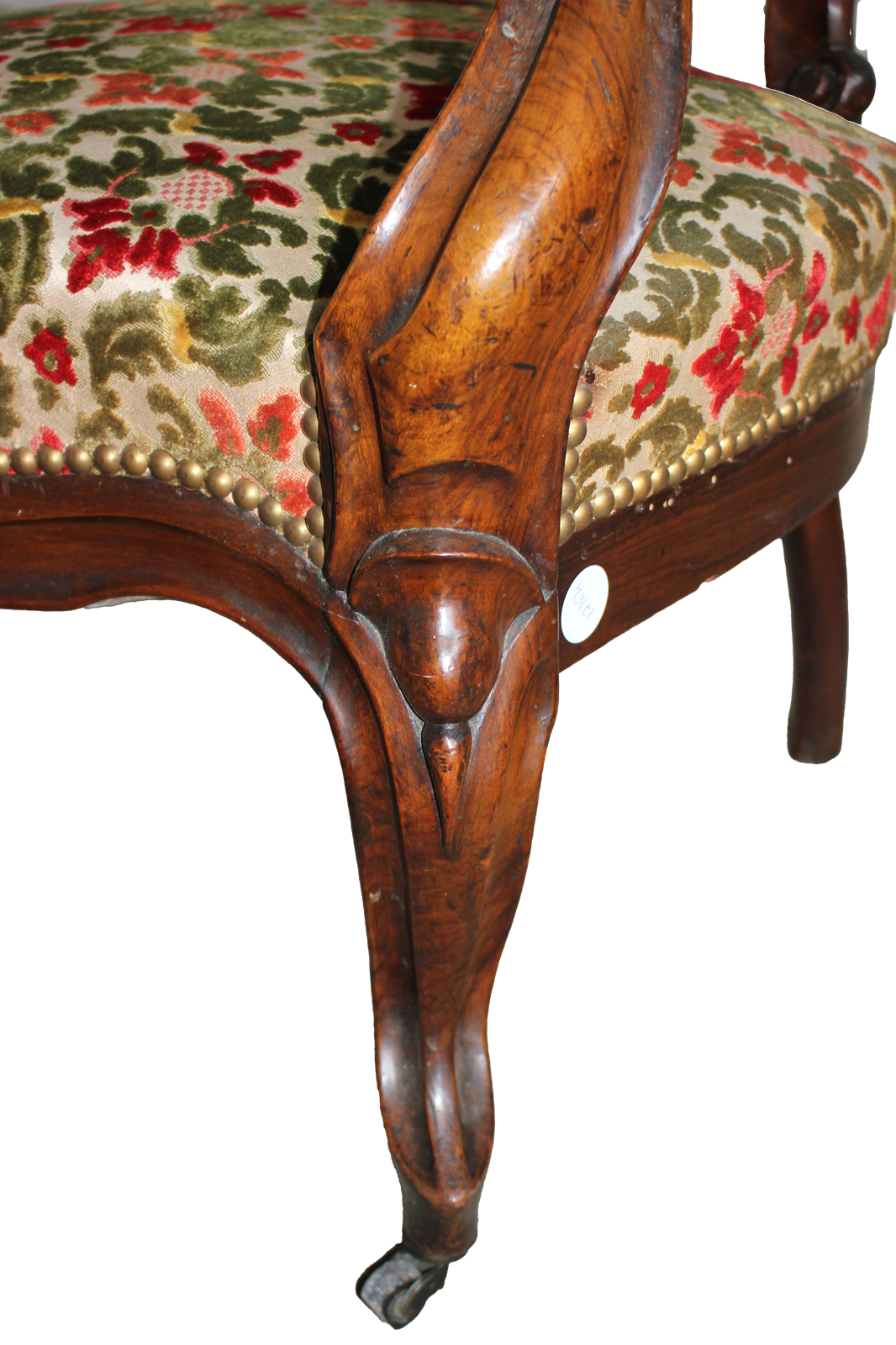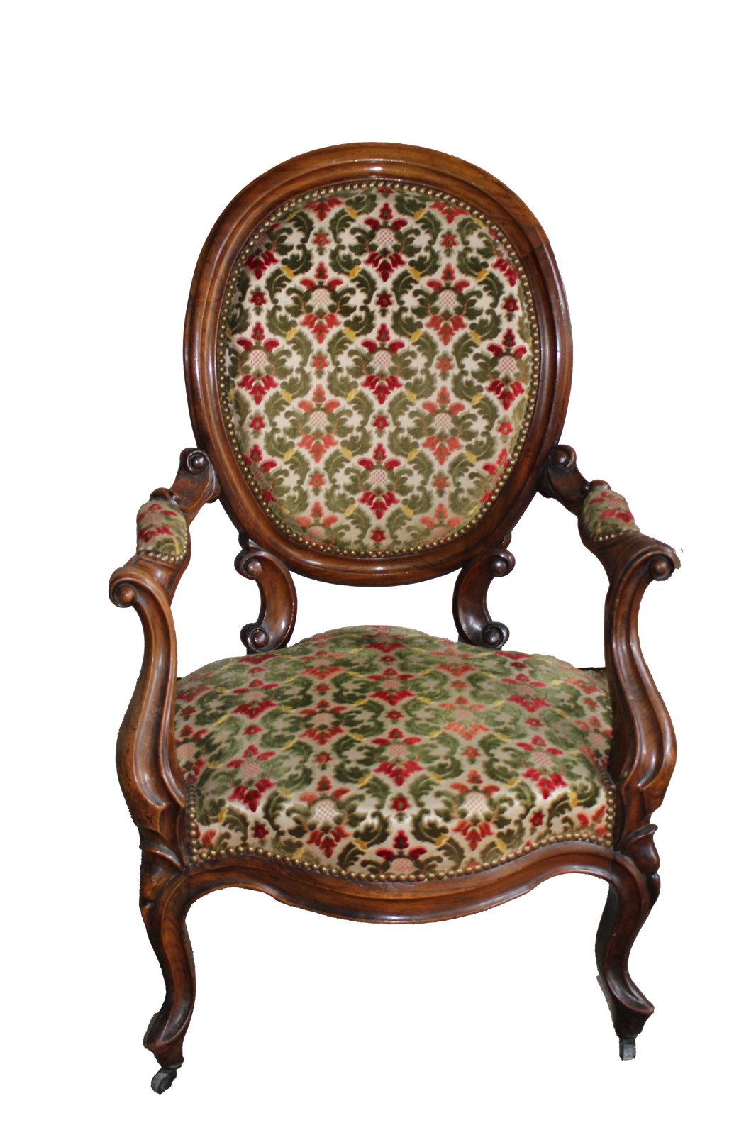 Raffinata poltrona a medaglione francese della seconda metà dell’Ottocento, in stile Luigi Filippo. Realizzata in massello di noce e rivestita con un pregiato velluto operato.