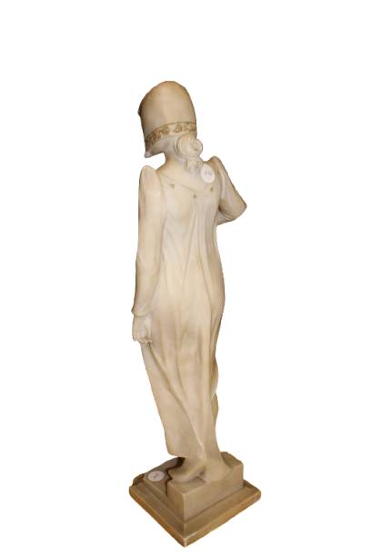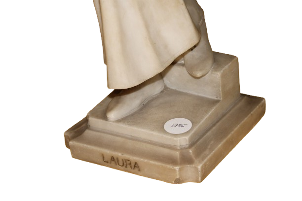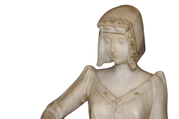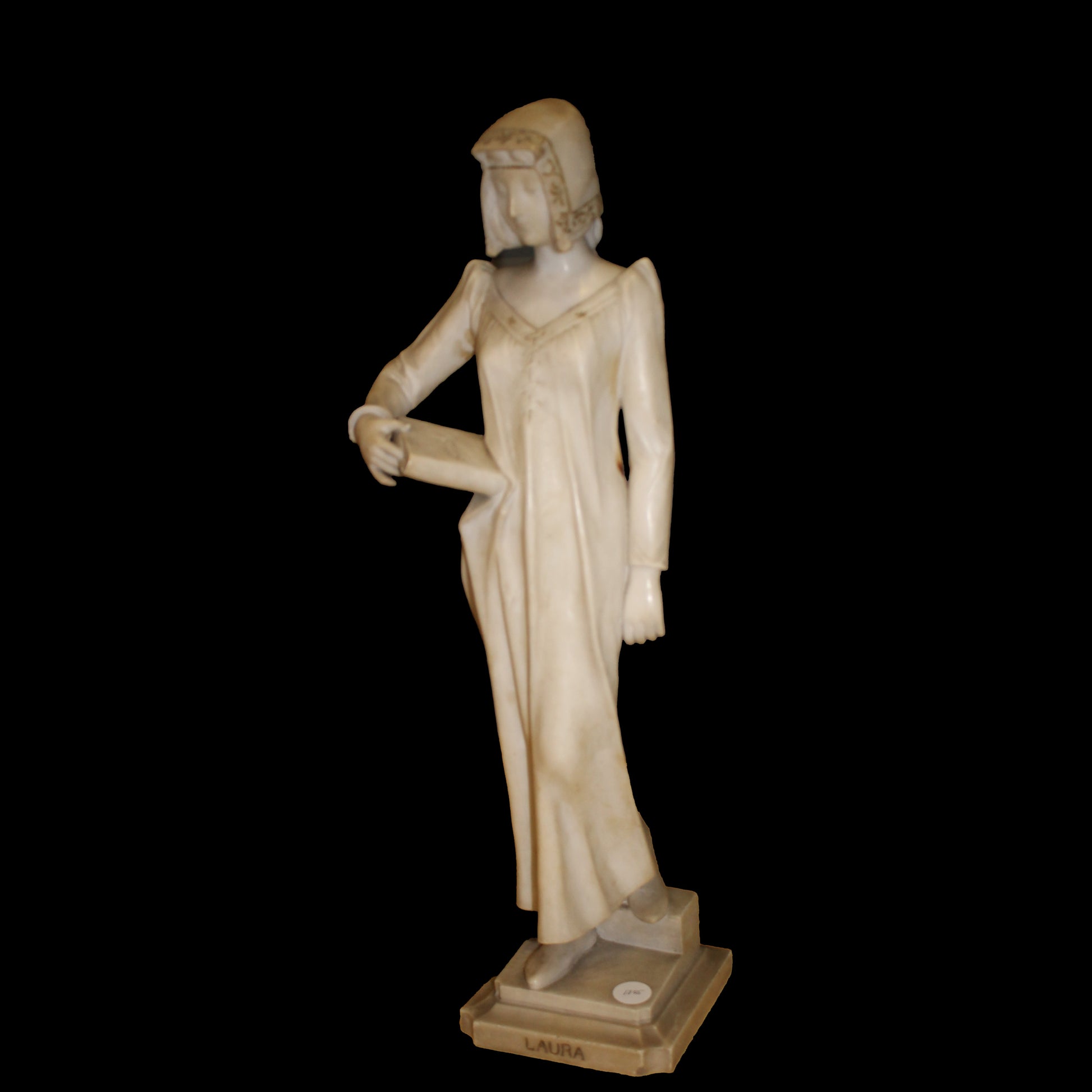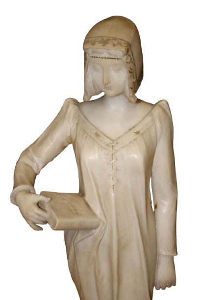 Magnifica scultura francese della seconda metà del 1800 in marmo bianco raffigurante dama con libro.
