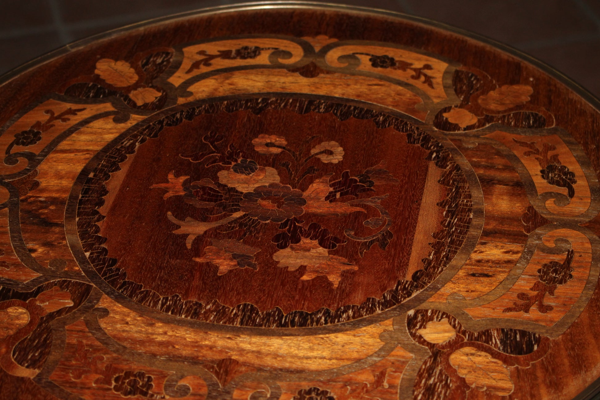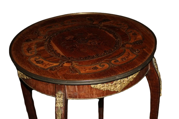 Tavolino Circolare Gueridon Francese stile Luigi XV del 1800 intarsiato