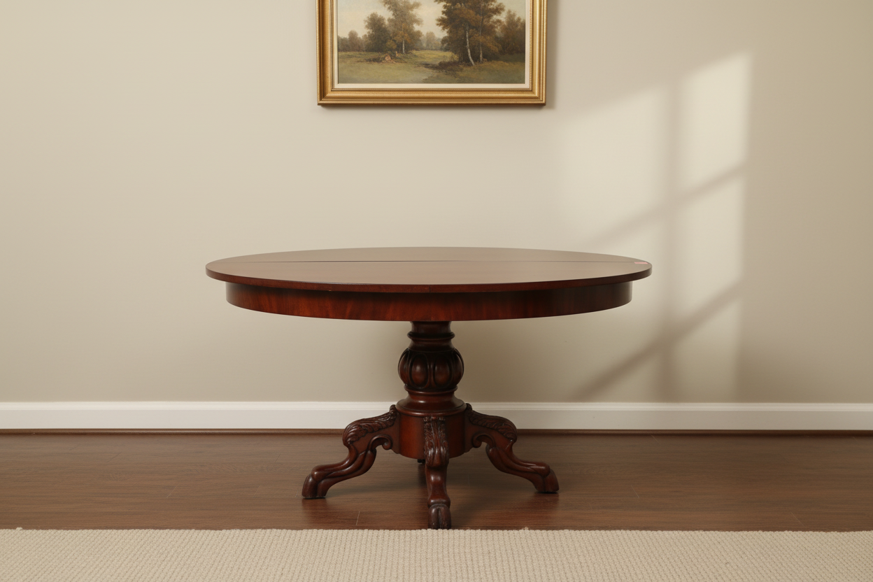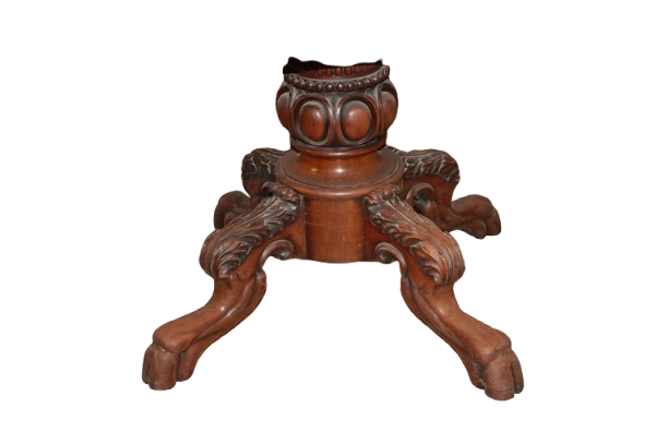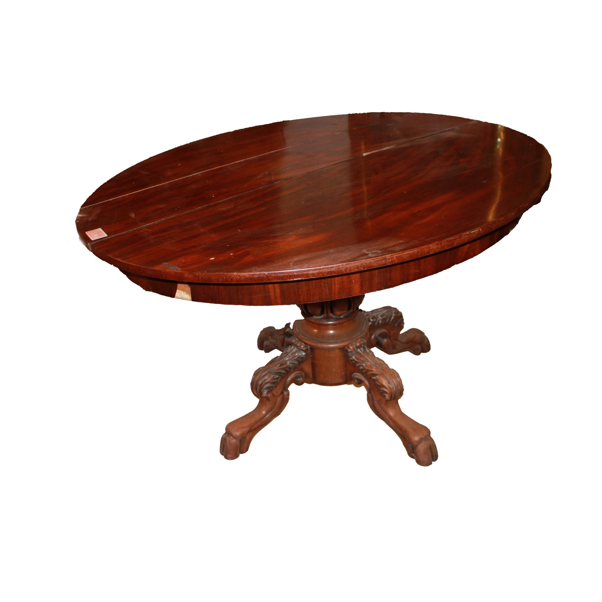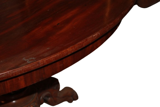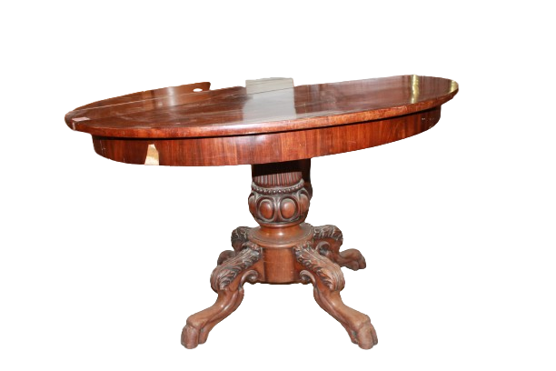 Tavolo ovale Nord Europa di metà 1800 stile Biedermeier in legno di mogano e piuma di mogano. Presenta basamento a ceppo centrale riccamente intagliato che si dirama in 4 gambe.