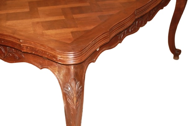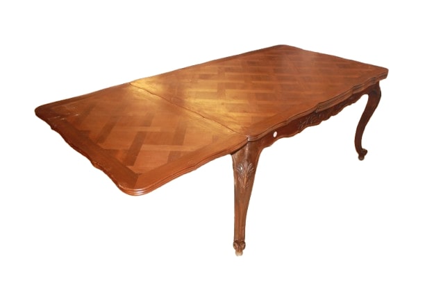 Tavolo francese rettangolare allungabile di fine 1800 inizio 1900 stile Provenzale in legno di noce. Presenta piano parquettato, motivi di intaglio su fascia sottopiano e gambe mosse. Dotato di 2 allunghe sotto tiro estraibili.